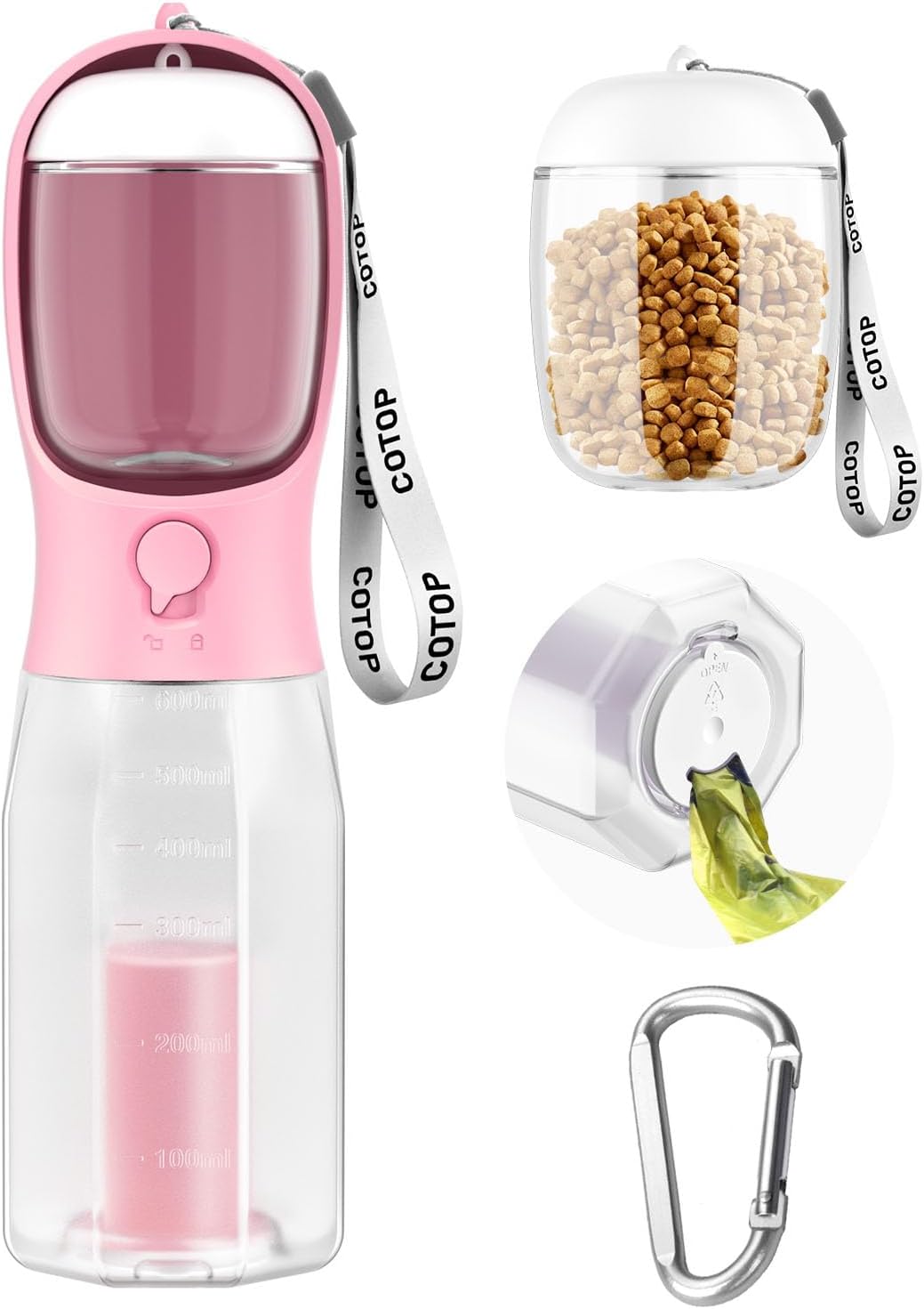 Make outdoor adventures easier with the 3-in-1 Dog Water Bottle. This portable dispenser combines a 20oz water bottle, a food container, and a built-in poop bag holderâeverything you need for walking, hiking, or traveling with your pup. The leak-proof design and carabiner clip let you carry it securely without mess, while the easy-pour spout ensures your pet stays hydrated on the go.